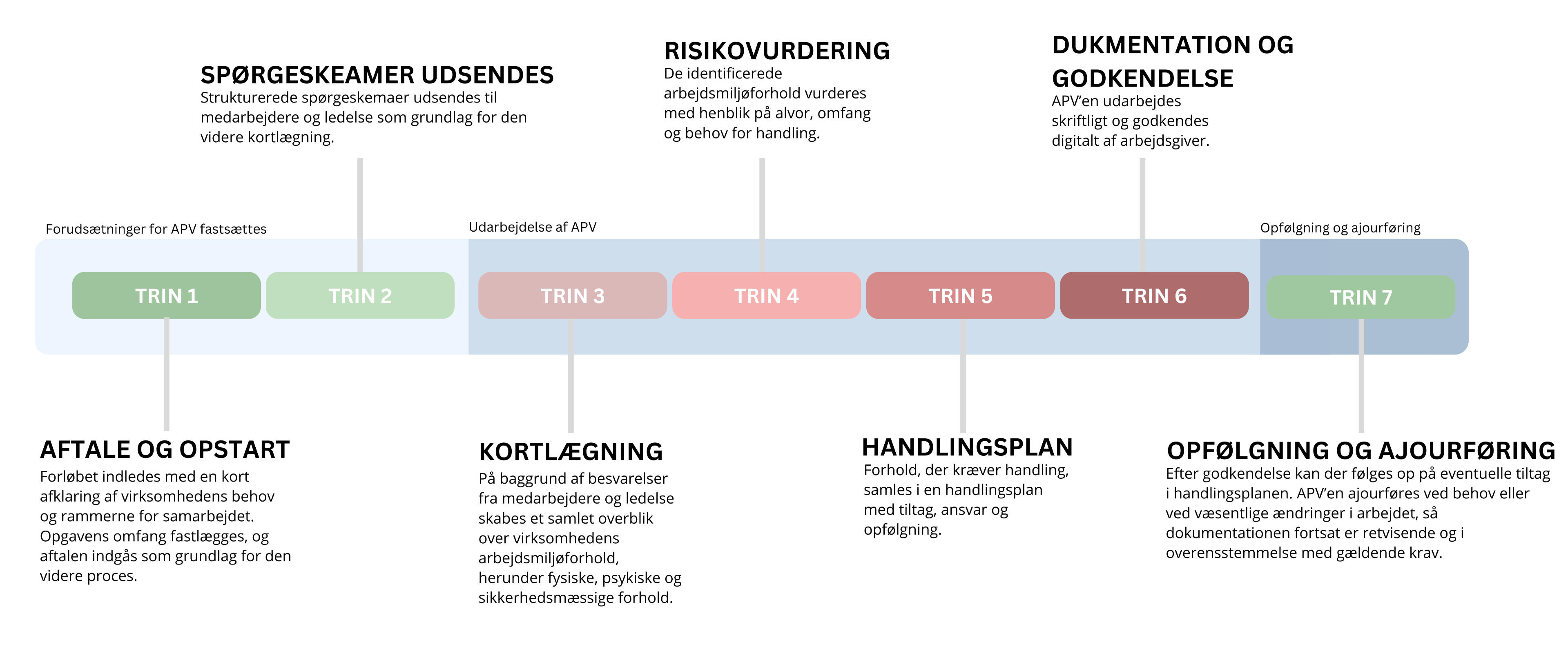 Udarbejdelsen af arbejdspladsvurderingen (APV) gennemføres som en struktureret og dokumenteret proces med inddragelse af både medarbejdere og ledelse.